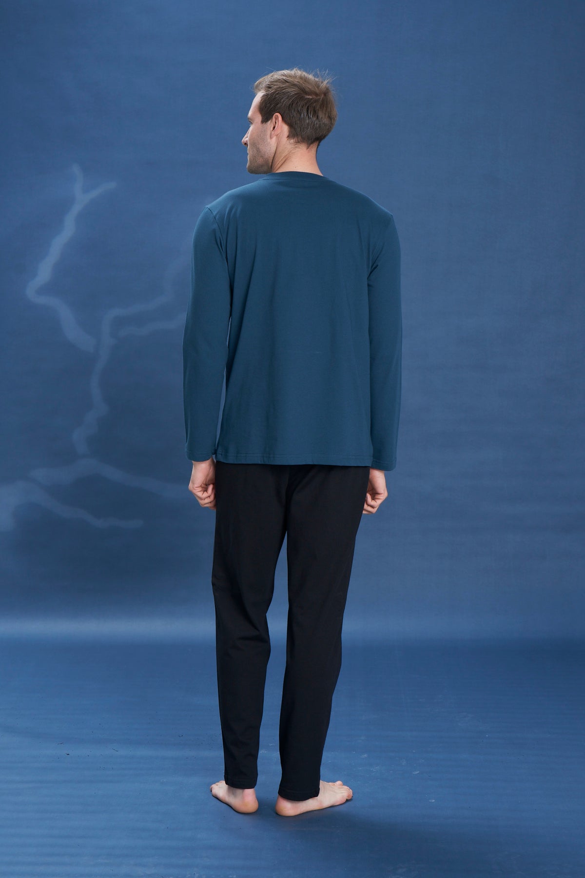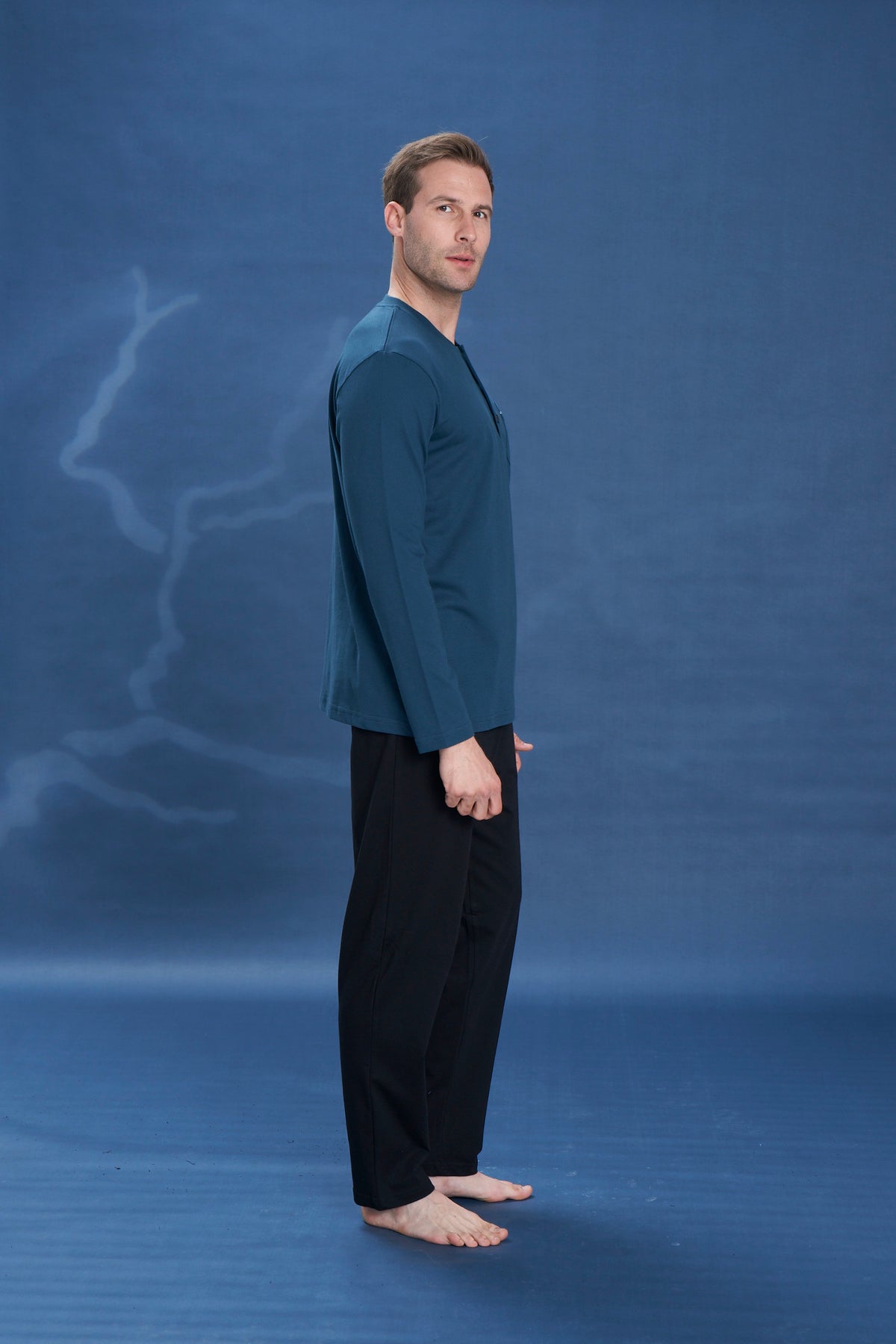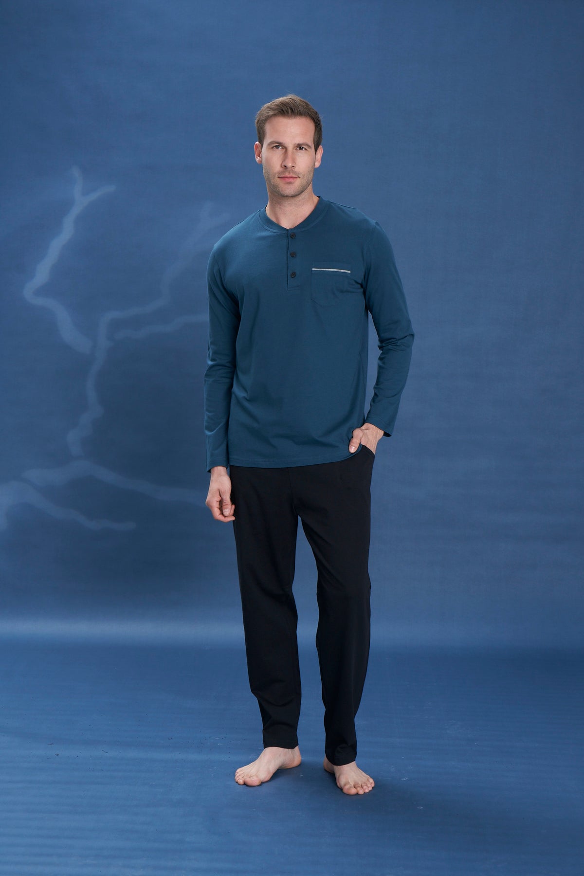 Erkek - Turkuaz Cepli Düz Uzun Kollu Süprem Kumaş Alt Üst Pijama Takımı